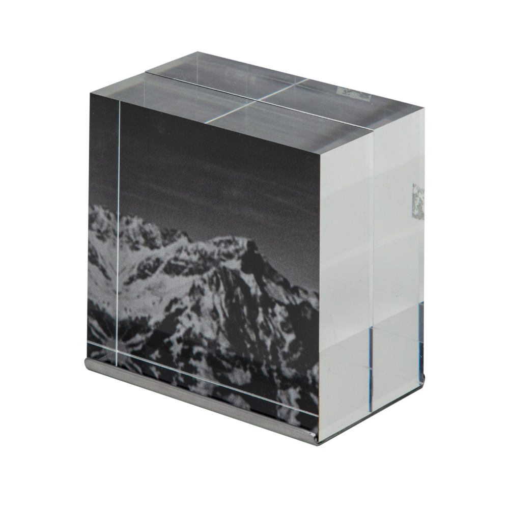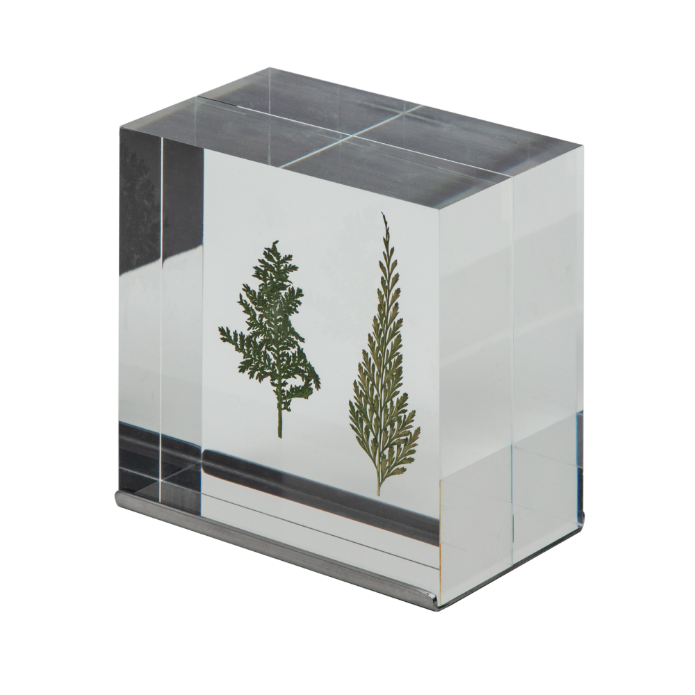 2つのアクリルブロックの間には、今はもう会えなくなった大切な人や憧れの存在の写真をセットしてみてください。アクリルが重なり合うことで生まれる光の屈折によって被写体が浮かび上がり、こちらに近づいてくるような感覚を覚えることでしょう。また、押し花や鳥の羽根、お気に入りのカードなどをセットすれば、Photo Blockはインテリアを引き立てるオブジェにもなります。