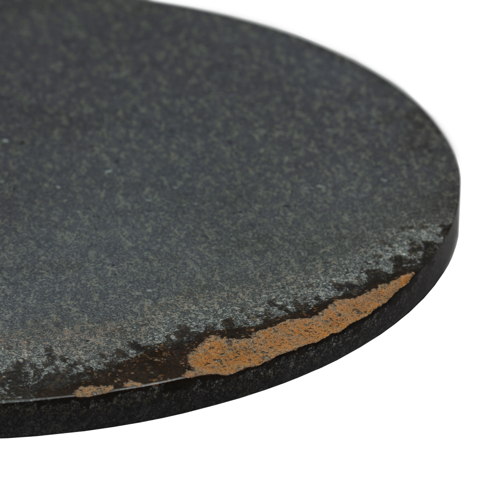Stone Altarの表面は、光沢をまとった美しい黒檀色です。その片端では、まるで焼けた鉄のような石肌がうっすらと姿を覗かせています。このユニークな表情をもつ石は、宮城県の大蔵山で採掘された伊達冠石。約2000万年前に起こった火山活動で吹き上がったマグマは、冷え固まらないまま海底に潜っては浮き上がり、海水の塩分と反応を起こすことで分解が進んでいきました。こうして形成された非常に希少性の高い石が、伊達冠石なのです。